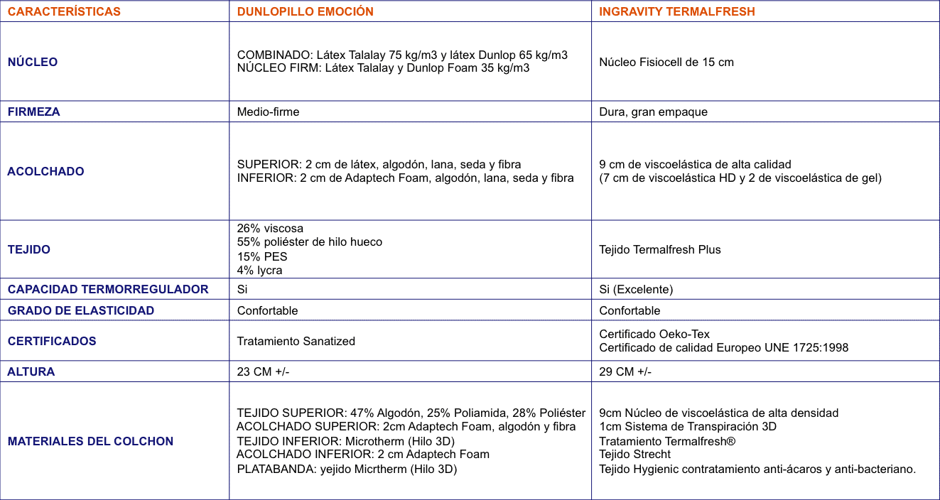 Ambos modelos ofrecen unas magníficas prestaciones. El colchón Dunlopillo Emoción viene avalado por la OCU (el único colchón que ha sido elegido como mejor colchón del año durante 5 años consecutivos). Por nuestra experiencia el colchón Termalfresh de la marca Ingravity también ofrece un elevado grado de satisfacción entre los clientes que lo han comprado.