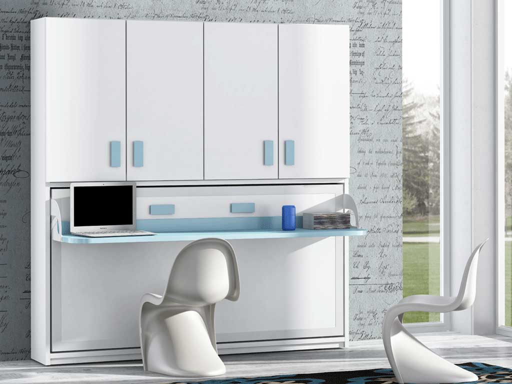• Cama abatible: Sin duda una de las soluciones más utilizadas en los últimos años. La cama queda totalmente plegada y adosada a la pared durante el día, dejando ese espacio libre. A menudo integran un escritorio que queda escondido durante la noche.cama abatible para habitaciones juveniles pequeñas