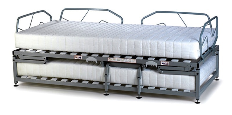 Sistema de elevación y plegado especial, con doble pestillo de seguridad. El sistema de plegado único de la litera Vega de Pardo, permite que en el espacio de una cama individual, quepa una cama doble.